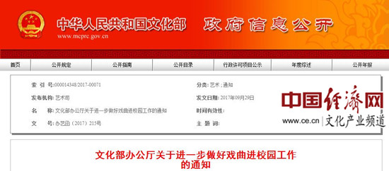 2017年7月31日,中宣部、教育部、财政部、文化部4部门联合印发《中共中央宣传部等印发<关于戏曲进校园的实施意见>的通知》(中宣发〔2017〕26号),对戏曲进校园的指导思想、基本原则、总体目标、时间安排、参与对象、主要形式、组织管理等提出了要求,并明确了宣传、教育、财政、文化系统的工作任务。